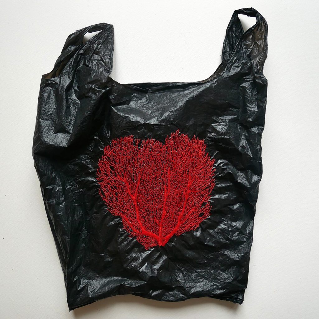 “ Je déjoue ce savoir-faire. Je confronte technique, matières et sujets pour révéler des images sur des matériaux parfois peu communs en broderie traditionnelle. Un dialogue émerge alors entre ce qui est représenté et l’objet support. La broderie fait acquérir à ces objets une nouvelle dimension artistique en les détournant de leur usage initial. Par ce geste, je réinterroge leur valeur, leur mode de fabrication et leur temps de réalisation. Je leur offre une nouvelle histoire.”