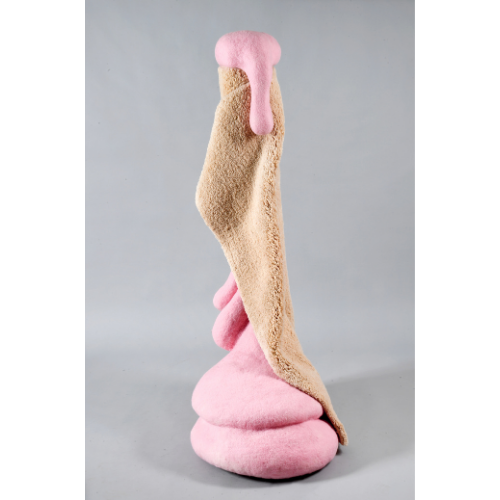 J’ai exposé pour la première fois en 2021 dans le cadre de mon incubation par Lainamac lors de la Paris Design Week. Quelques temps après, j’ai eu une commande du Mobilier national pour les Aliénés. Pour ce projet, je me suis appuyée sur un tapis de la manufacture de Lodève qui était présenté comme réalisé par des “femmes de harkis”. C’est ce vocable  – “femme de” – et l’histoire de la décolonisation, qui me concerne à titre familial et personnel, que j’ai eu envie d’interroger à travers cette œuvre. J’ai donc “redressé” le tapis en une colonne textile, dont j’ai fait s’épancher un fluide rose, éminemment libre.