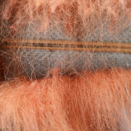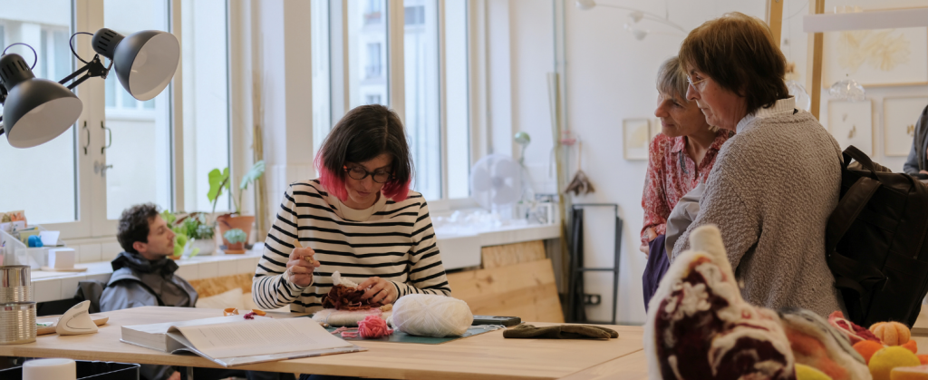 Et puis à l’été 2024, je me suis installée au JAD. Je cherchais en effet un espace de travail me permettant de créer des grands formats. J’étais aussi à la recherche de possibilités de collaboration et d’échanges de savoir-faire. Enfin, le décloisonnement est central dans ma pratique et le JAD offre justement un espace où on est appelé à faire tomber les murs, ce qui est extrêmement rare et d’autant plus grisant. Aujourd’hui, j’entrevois déjà quelques pistes de collaborations comme avec Cédric Breisacher autour de panneaux d’insonorisation en laine et fécule de pomme de terre ou encore avec Carole Calvez sur des diffuseurs d’odeurs en laine. Au-delà des collaborations, il y a aussi tous les échanges du quotidien. Par exemple, hier, Marion Gouez m’a appris à filer la laine. Je retrouve ici la fluidité et la notion de compagnonnage que j’ai connues à mes débuts en Russie.