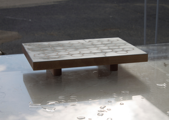 Guéridon en terres émaillées, dans l’exposition « Aléas, pratiques de l’adaptation » © Lucie Ponard
