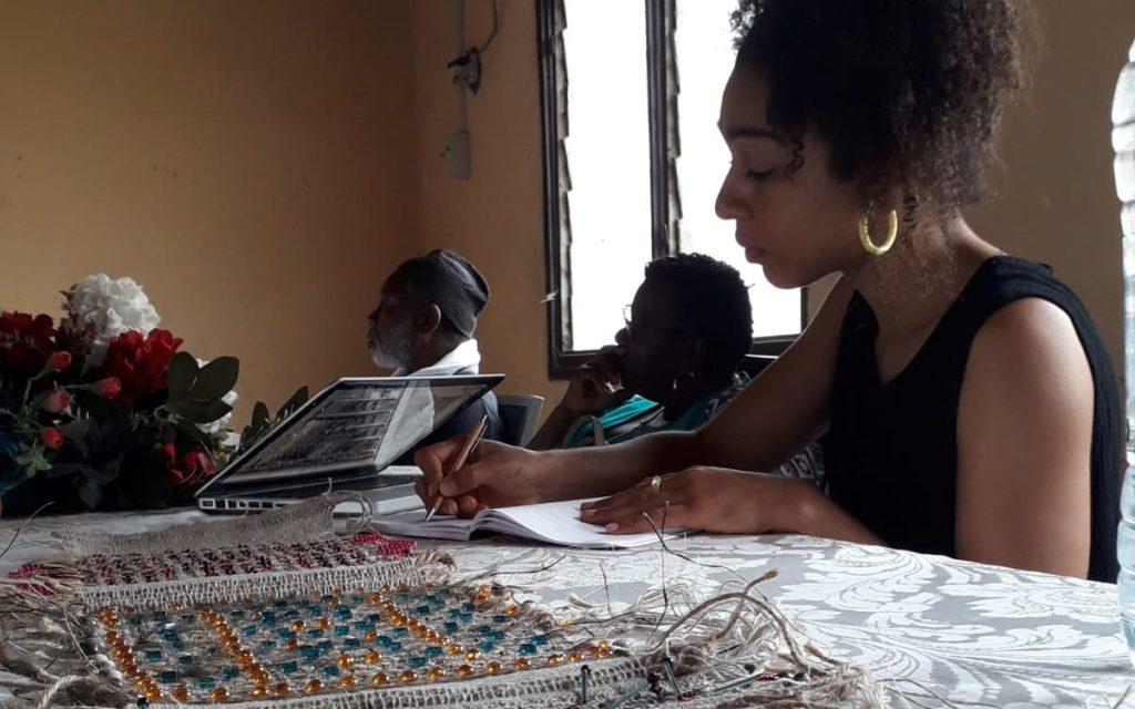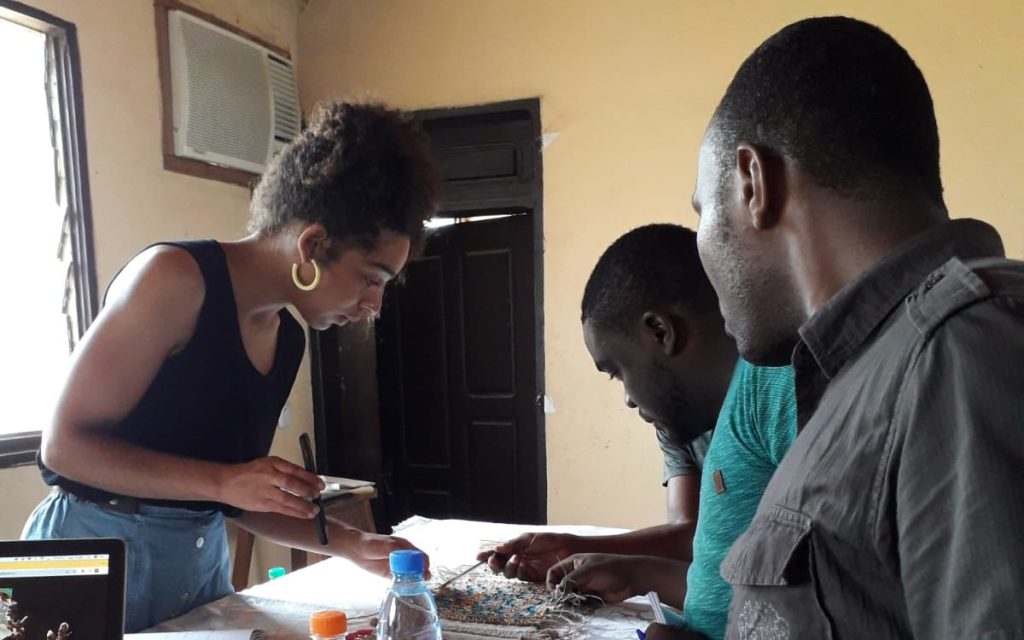 Au cours de cette résidence, notre objectif a donc été de comprendre la transformation de ces fleuves, et ses impacts sur la vie locale, des difficultés dans le domaine de la pêche aux limitations de déplacement, en passant par le bouleversement des écosystèmes et des imaginaires. Nous avons donc consacré une grande part de notre temps à l’observation et aux échanges avec les acteurs locaux. Nous avons ainsi rencontré les instances de la région du littoral, des chefs de villages, des maires, des artistes, ainsi que des habitants de Ndoulou-Badou, le village dans lequel nous étions basées, qui est aussi le village dont mon père est originaire. Ces nombreuses discussions nous ont permis de mieux comprendre leur rapport au fleuve et les implications politiques de cette invasion, mais aussi de recueillir leurs idées et leurs points de vue sur notre projet de valorisation de la jacinthe d’eau, dans une démarche de co-construction avec les habitants et les acteurs locaux.